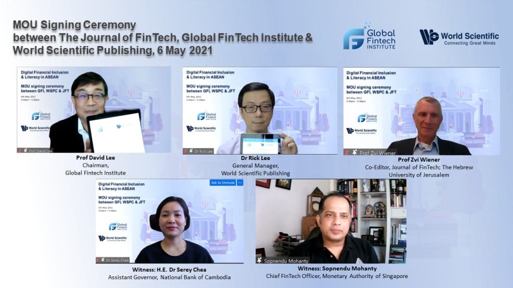 Singapore, 7 May 2021 – Global FinTech Institute (GFI) announced that it has inked a Memorandum of Understanding (MOU) with the World Scientific Publishing Co (WSPC) on the collaboration of the Journal of FinTech (JFT) and Book Series in a virtual ceremony held last evening. Gracing the virtual event were Her Excellency Dr Serey Chea, Assistant Governor of National Bank of Cambodia, and Mr Sopnendu Mohanty, Chief Fintech Officer, Monetary Authority of Singapore (MAS).