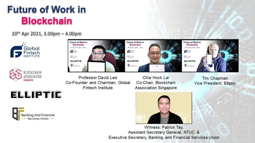The virtual event, organised by GFI and BAS, was subsequently followed by a webinar on the Future of Work in Blockchain. Panellists included Patrick Tay, Assistant Secretary-General, National Trades Union Congress (NTUC) and Executive Secretary, Banking and Financial Services Union (BFSU); Tim Chapman, Vice President of Sales, Elliptic; Chia Hock Lai, Co-chairman of BAS and Professor David Lee, Chairman at Global FinTech Institute.