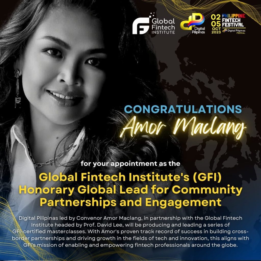 “I am humbled and honored to be appointed as the Honorary Global Lead for GFI. I look forward to this great opportunity to drive impactful change and unlock unprecedented opportunities for individuals and economies as we help shape the future of FinTech globally,” said Maclang on her appointment.